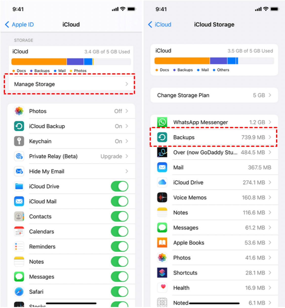 • Tout d’abord, assurez-vous d’avoir activé la sauvegarde iCloud sur votre iPhone. Pour cela, accédez à Paramètres > (Votre nom) > iCloud > Gérer le stockage > Sauvegardes.