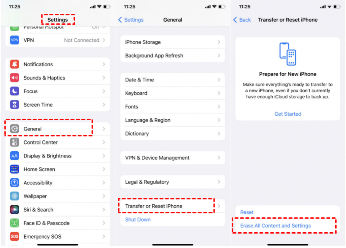 • Pour restaurer les données supprimées de votre sauvegarde iCloud sur l’iPhone, vous devez supprimer tout son contenu. Accédez à Paramètres > Général > Réinitialiser > Effacer tout le contenu et les paramètres.
