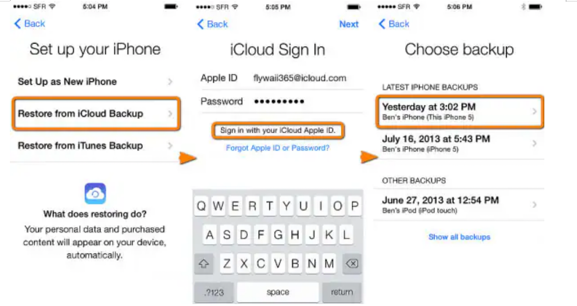 • Connectez-vous à votre compte iCloud et sélectionnez la sauvegarde la plus récente contenant vos contacts et messages texte perdus.