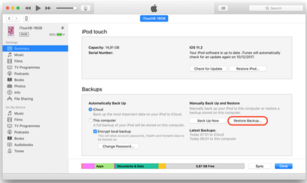 Une autre alternative de sauvegarde pour récupérer des contacts ou des messages perdus sur votre iPhone est via la sauvegarde iTunes. Si vous avez connecté votre iPhone à un Mac ou un PC, vous avez peut-être sauvegardé votre appareil à l’aide d’iTunes. La récupération des données perdues à l’aide de la sauvegarde iTunes implique la restauration de votre iPhone à un état antérieur. Pour récupérer des données supprimées à l’aide de la sauvegarde iTunes, vous devez :