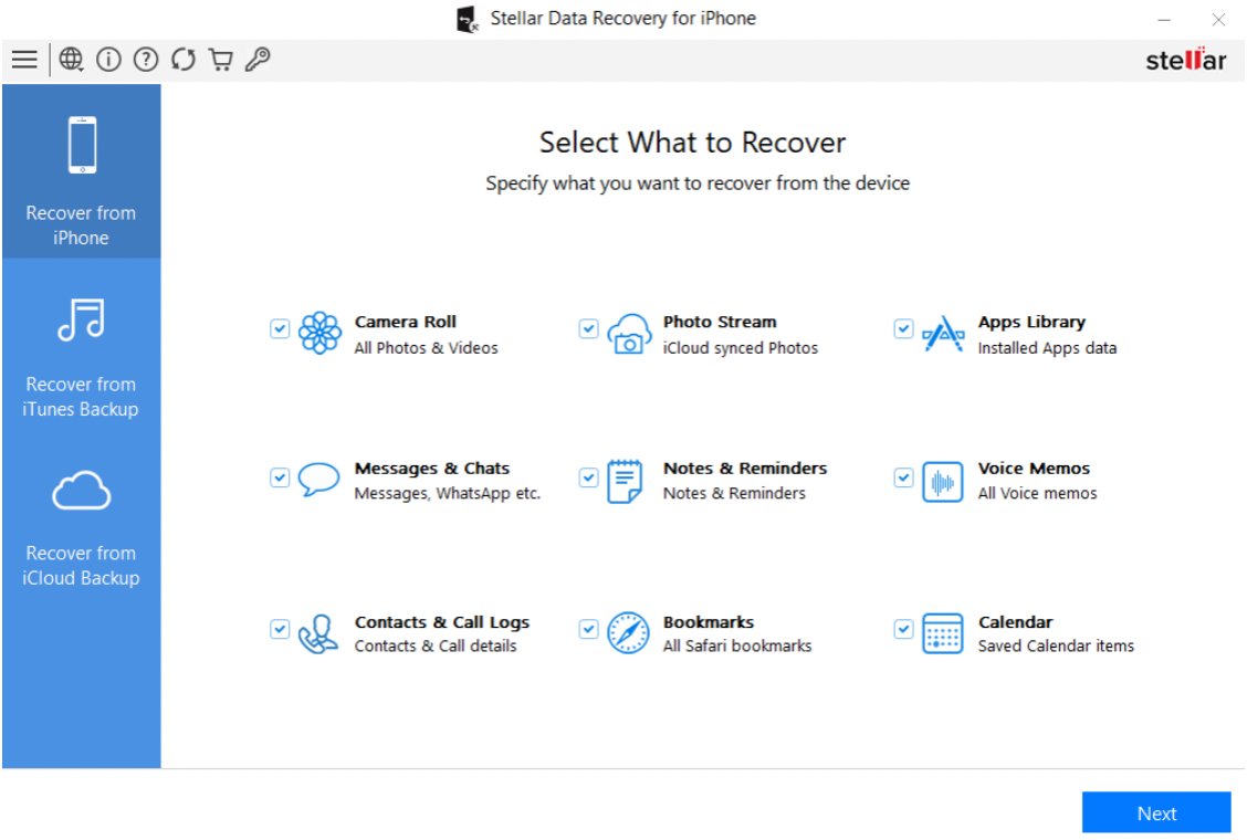 Étape 1 : Téléchargez et installez le logiciel Stellar Data Recovery for iPhone sur votre appareil Windows ou Mac. Lancez le logiciel et, depuis la page d’accueil, choisissez Récupérer depuis l’iPhone et sélectionnez le type de données que vous devez restaurer. Cliquez sur Suivant pour continuer.