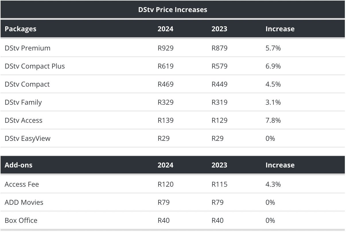 Les augmentations de prix de DStv pour 2024 sont résumées dans le tableau ci-dessous.