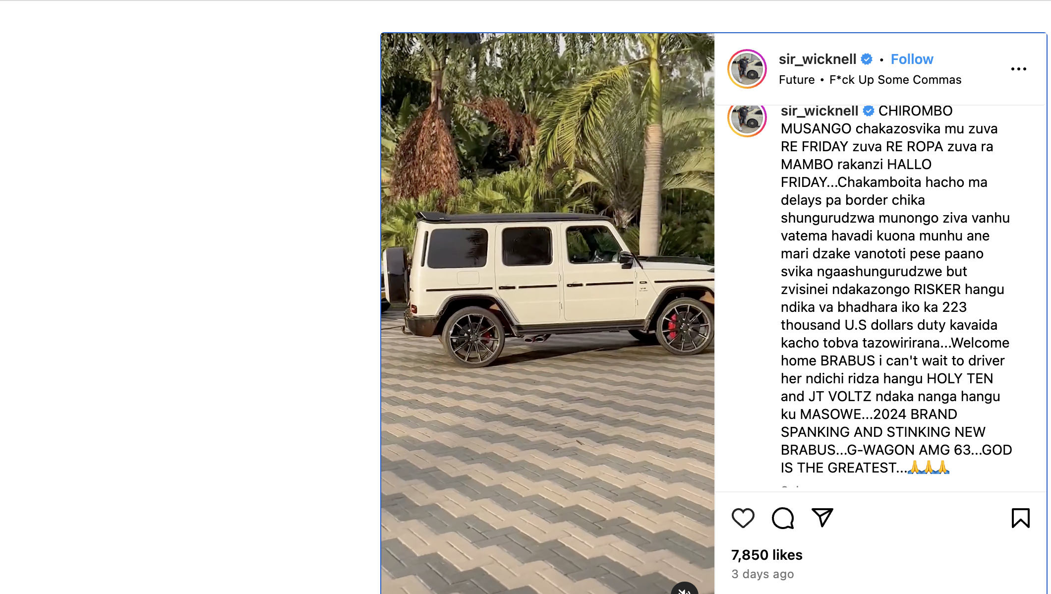 Le magnat des affaires zimbabwéen Sir Wicknell Chivayo est à la tête des tendances après que sa Mercedes-Benz G 63 Brabus 2023 a été repérée dans les rues de Harare.