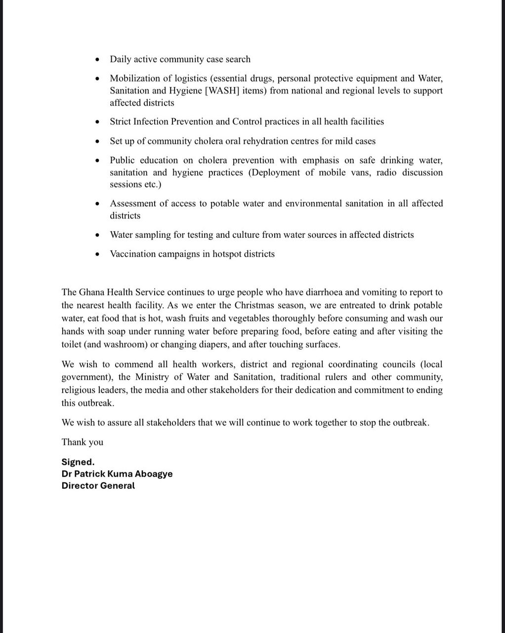 Le Dr Aboagye a également souligné l’importance de la vigilance du public, exhortant les personnes présentant des symptômes tels que diarrhée et vomissements à se présenter immédiatement à un établissement de santé. Il a encouragé le public à prendre les précautions nécessaires, en particulier pendant la période des fêtes, notamment en buvant de l’eau propre et potable, en mangeant des aliments chauds, en lavant soigneusement les fruits et légumes et en pratiquant une bonne hygiène en se lavant les mains avec du savon et de l’eau courante avant de manger, en préparant de la nourriture, et après être allé aux toilettes ou avoir changé une couche.