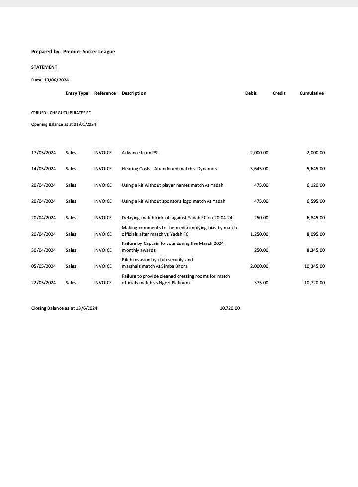 Vous trouverez ci-dessous toutes les amendes infligées aux Pirates de Chegutu jusqu'à présent cette saison.