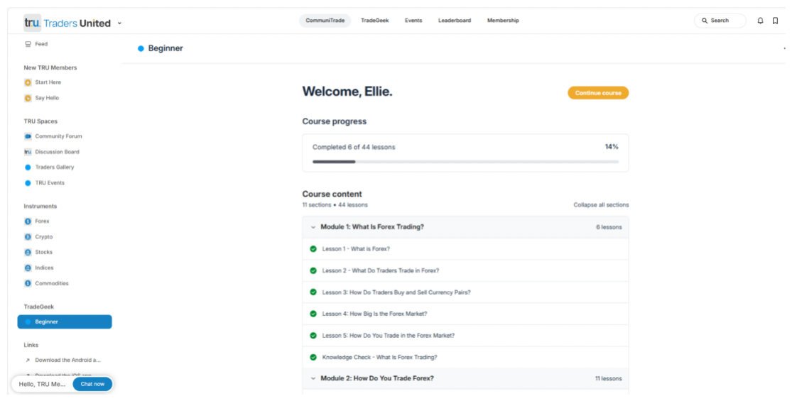 Les membres TRU peuvent accéder à tous les cours TradeGeek sur CommuniTrade avec les fonctionnalités supplémentaires suivantes :