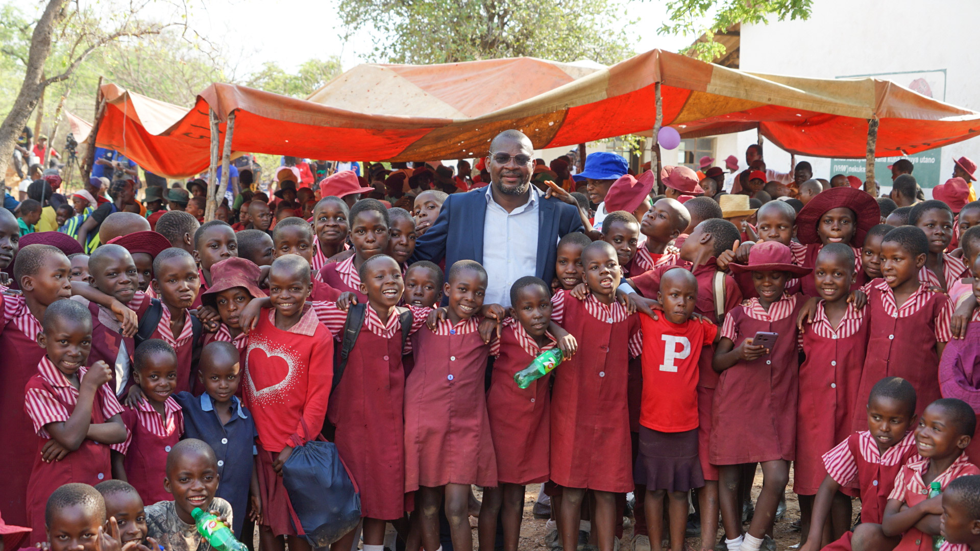 Emmanuel Pasura pose pour une photo avec les élèves de l’école primaire de Madudzo